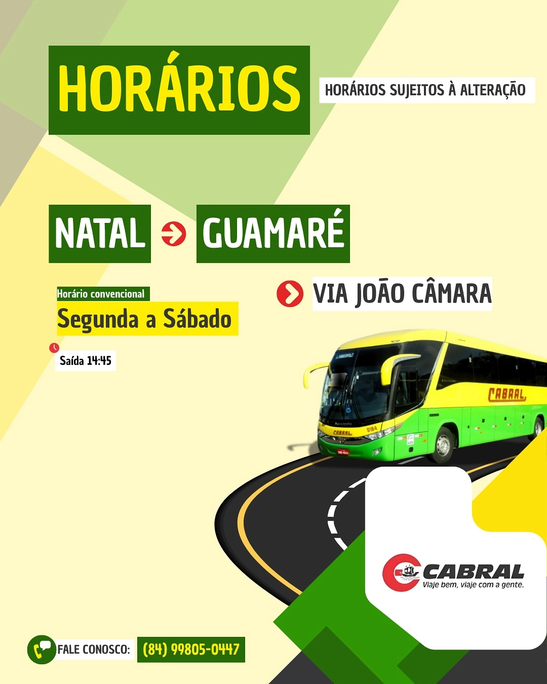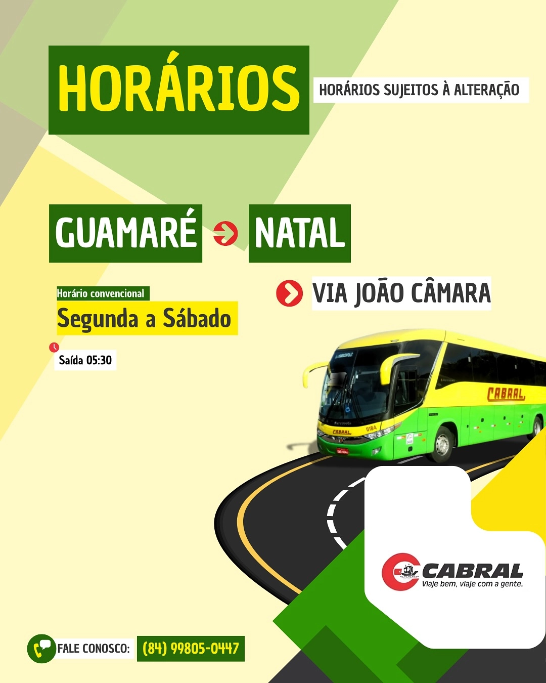 A empresa Expresso Cabral, que detém a concessão das linhas da região salineira, empresa essa pioneira no transporte de passageiros na região da Costa Branca do Rio Grande do Norte, informa os horários para a linha Guamaré/Natal e Natal/Guamaré, com o objetivo de oferecer mais comodidade para a população guamareense, para tirar duvidas acesse as redes sociais da empresa, Instagram – Confira os horários;
